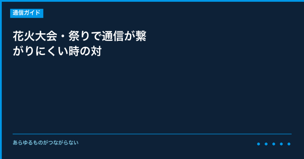 花火大会・祭りで通信が繋がりにくい時の対処法について、事前に知っておくべき情報と具体的な対策をご説明いたします。 特定の時期に発生しやすいトラブルは、事前の対策で影響を最小限に抑えることができます。 【なぜこの時期にトラブルが増えるのか】 ... -
